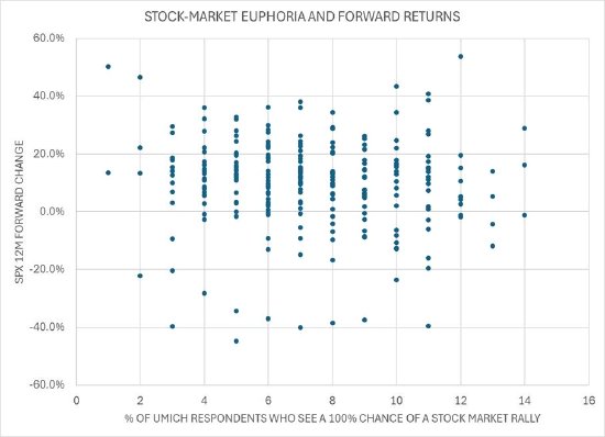 散点图表明悲观情绪主导下的回归曲线更加线性。这些数据似乎最适合用于绝望情绪高涨的孤立案例,而这种情况历来预示着极佳的购买机会。有趣的是,本月密歇根大学初值调查显示,6%的受访者表示未来一年股市没有反弹的机会。这与远期回报率极佳的情况一致。