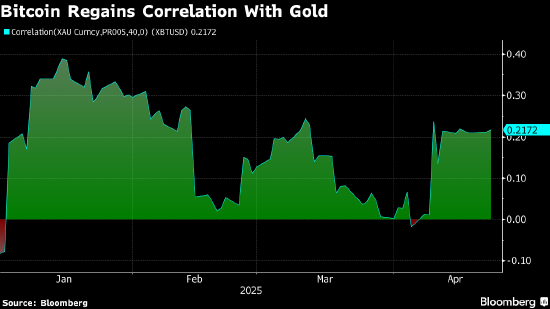 在短暂受到美国总统唐纳德·特朗普宣布对地缘政治盟友和对手广泛征收关税而引发的风险资产抛售冲击后,比特币已从4月7日的低点反弹近20%。在此过程中,其交易表现开始更接近黄金 —— 在关税不确定性扰动市场之际,黄金成为表现最为突出的资产。