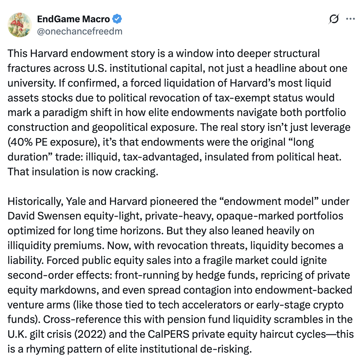哈佛捐赠基金事件折射出美国机构资本更深层的结构性裂痕,而绝非仅仅是关于某所大学的新闻头条。若情况属实,因政治因素撤销免税地位迫使哈佛清仓其最流动的资产——股票,这将标志着精英捐赠基金在投资组合构建和地缘政治风险暴露方面的应对方式发生范式转变。问题的核心不仅在于杠杆(40%的私募股权敞口),更在于捐赠基金原本是“长期投资”的典范:缺乏流动性、享有税收优惠、免受政治干扰。而如今,这种隔离正在破裂。